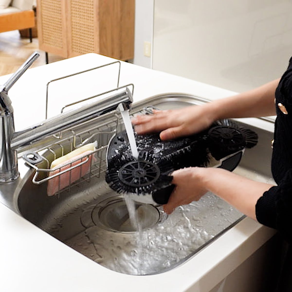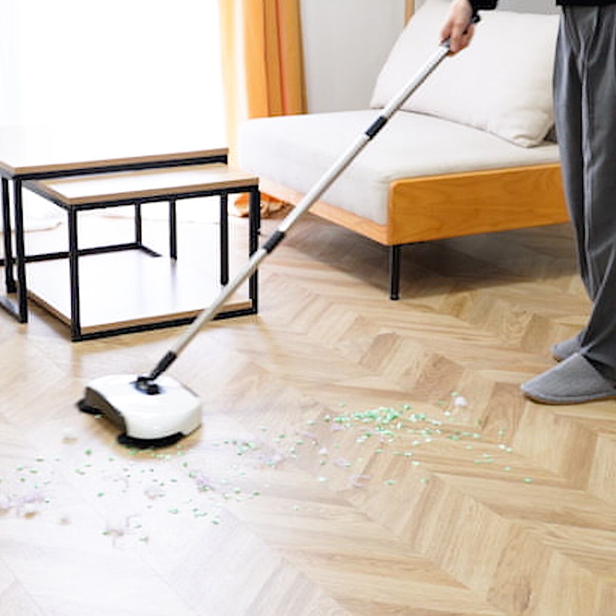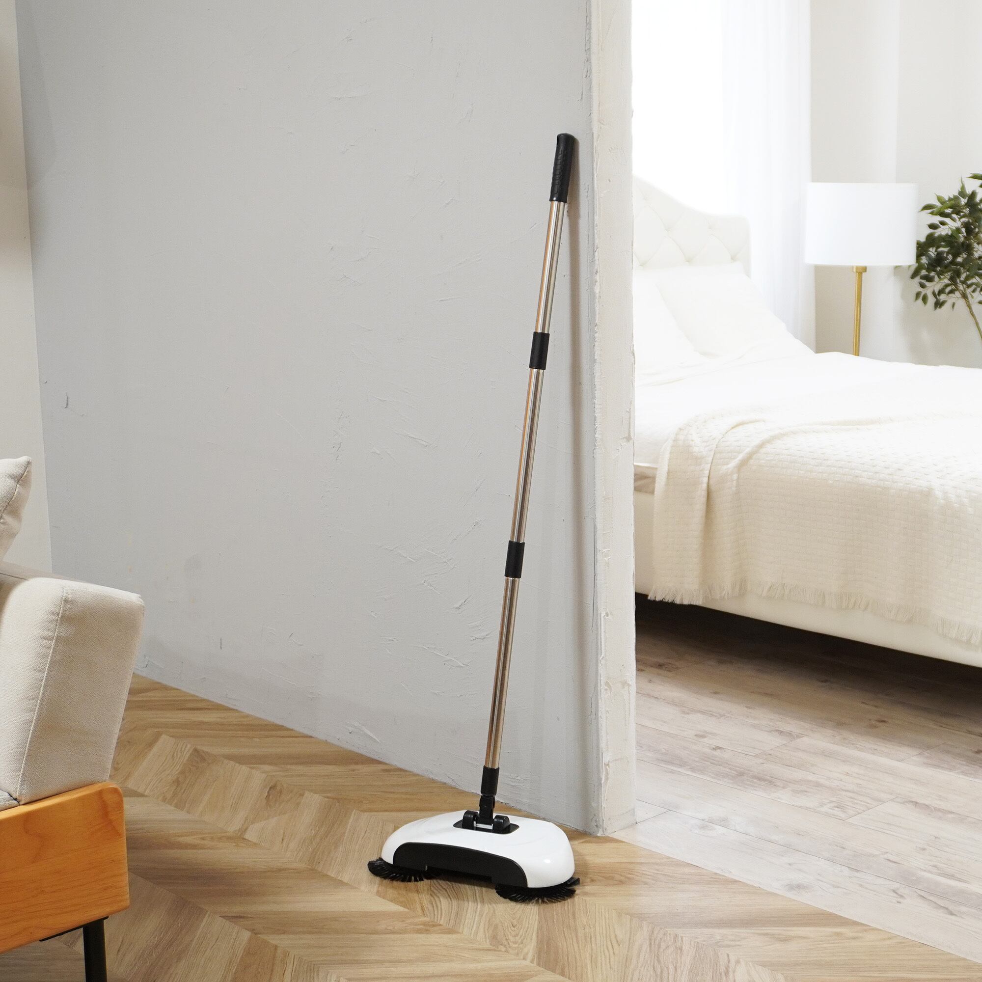 フローリングのお掃除はこれ1本で!韓国で生まれた万能ブラシ型のクリーナー。「掃く」「拭く」「集める」をこれ1本で完結。しかもサイズに比べて軽量。電気を使わず、でもまるでロボット掃除機の様にスイスイとお掃除、使いたい時にサッと使えるハンディタイプのブラシ型クリーナー。ロボット掃除機からヒントを得た回転ブラシ構造により、床のゴミやホコリをしっかりかき集め、同時にマイクロファイバークロスで乾拭き、水拭きも可能。卵などのベタつく汚れも軽々キャッチし、ゴミは本体内部の収納スペースにまとめてゴミを集められるので、ちりとり要らずで片付けまで完了。ほうき・雑巾・ちりとりの3役を1本でこなす、毎日の掃除がぐんとラクになる万能アイテム。電源不要のなのでモーター音も無く、夜やお店の営業中などでも安心して使用可能。しかも重さ575gと軽量なので高齢者の方や力の無い方でも楽ちんお掃除。掃除機を出すほどでもない、毎日のちょっとしたお掃除を片手で楽に、毎日の掃除が楽しくなる便利なお掃除アイテム。